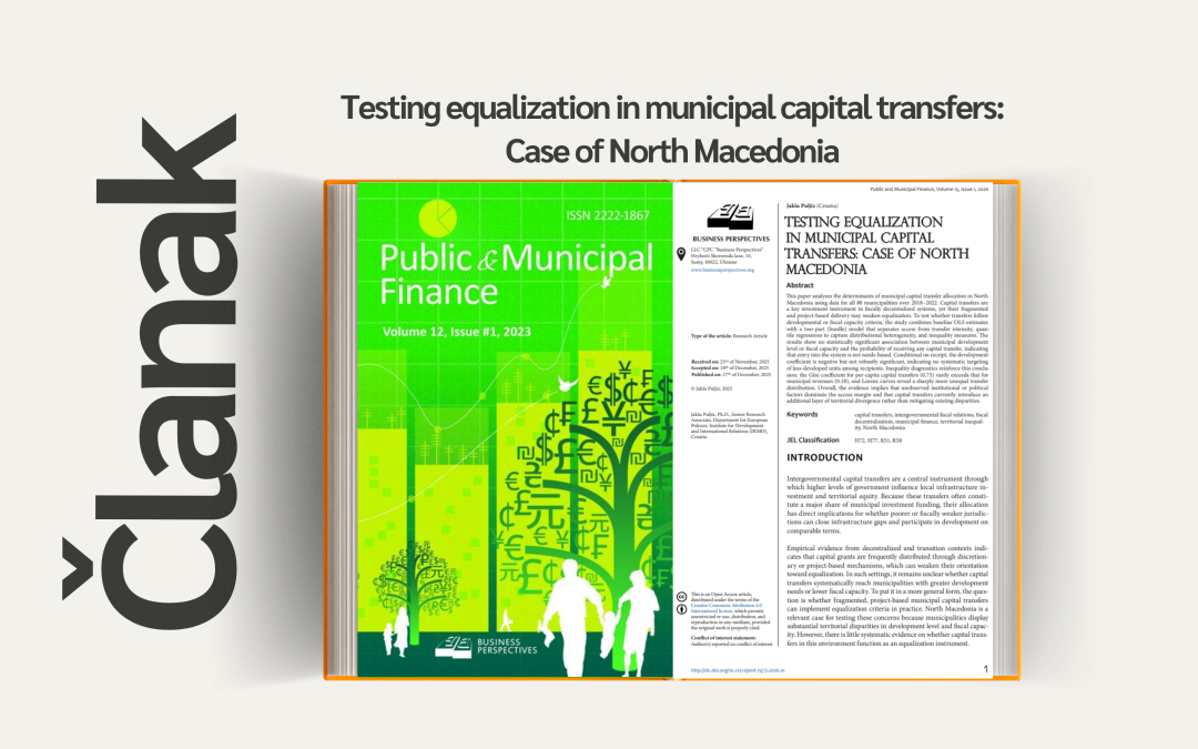 The Director of the Institute for Development and International Relations (IRMO), Jakša Puljiz, PhD, has published a new scientific paper titled “Testing equalization in municipal capital transfers: Case of North Macedonia” in the international journal Public and Municipal Finance.