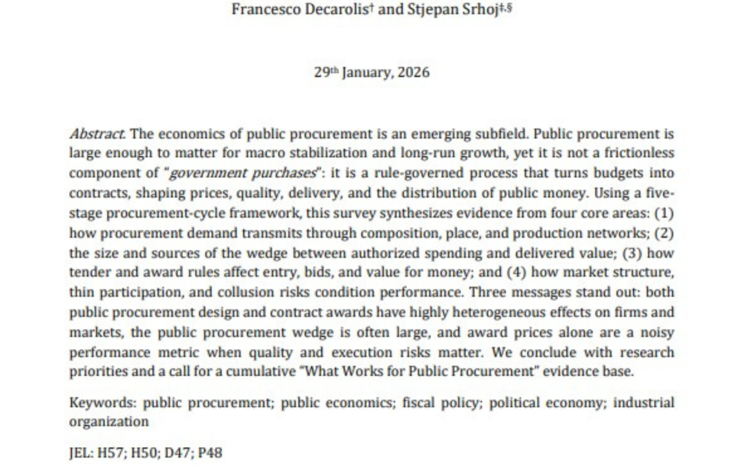 Javna nabava čini oko 15 % BDP-a, no unatoč toj veličini empirijski dokazi o tome što u javnoj nabavi stvarno funkcionira i dalje su relativno skromni, pa autori pozivaju na sustavnu izgradnju baze empirijskih dokaza “što funkcionira u javnoj nabavi” za donošenje boljih politika.