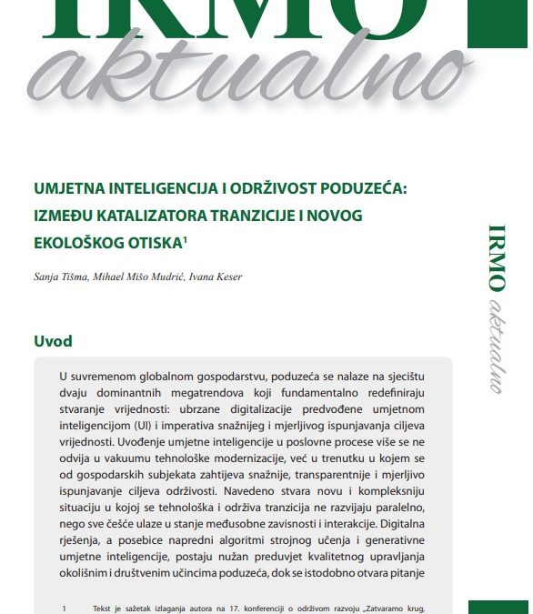 In the latest issue of IRMO aktualno, authors Sanja Tišma, Mihael Mišo Mudrić, and Ivana Keser analyze the complex interplay between today’s two leading megatrends: accelerated digitalization driven by Artificial Intelligence (AI) and the imperative for sustainable business practices. The authors emphasize that the technological and green transitions no longer unfold in parallel; instead, they have entered a state of profound interdependence, where advanced algorithms have become an indispensable tool for managing the environmental and social impacts of enterprises.
