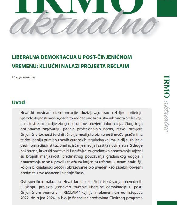 In the new issue of IRMO aktualno, Hrvoje Butković presents an overview of the key findings of the RECLAIM project (Horizon Europe), which analysed various dimensions of post-truth politics in Europe and their effects on democratic culture, the public sphere, and trust in institutions from October 2022 to September 2024, with the Institute for Development and International Relations (IRMO) participating as a partner institution.In the Croatian context, the article highlights that journalists perceive disinformation as a serious threat to the credibility and autonomy of journalism, emphasising the need to strengthen professional standards, fact-checking practices, and media literacy, alongside more consistent implementation of new EU regulations.